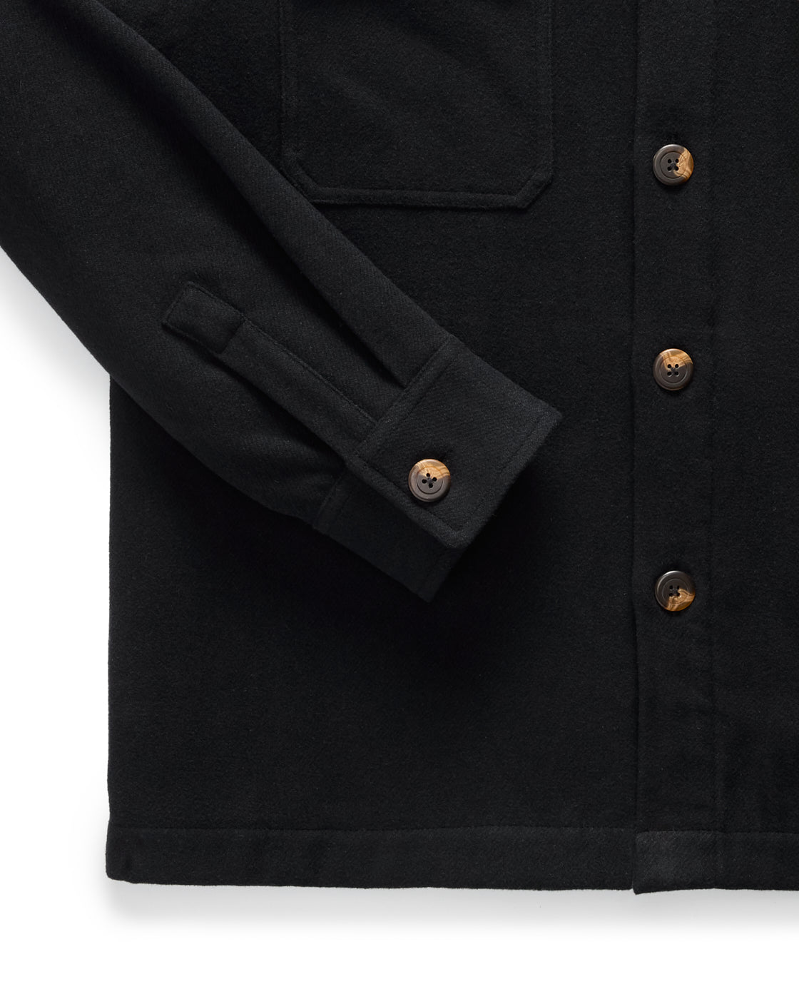 • Turned caramel buttons, single-button cuffs and square hem