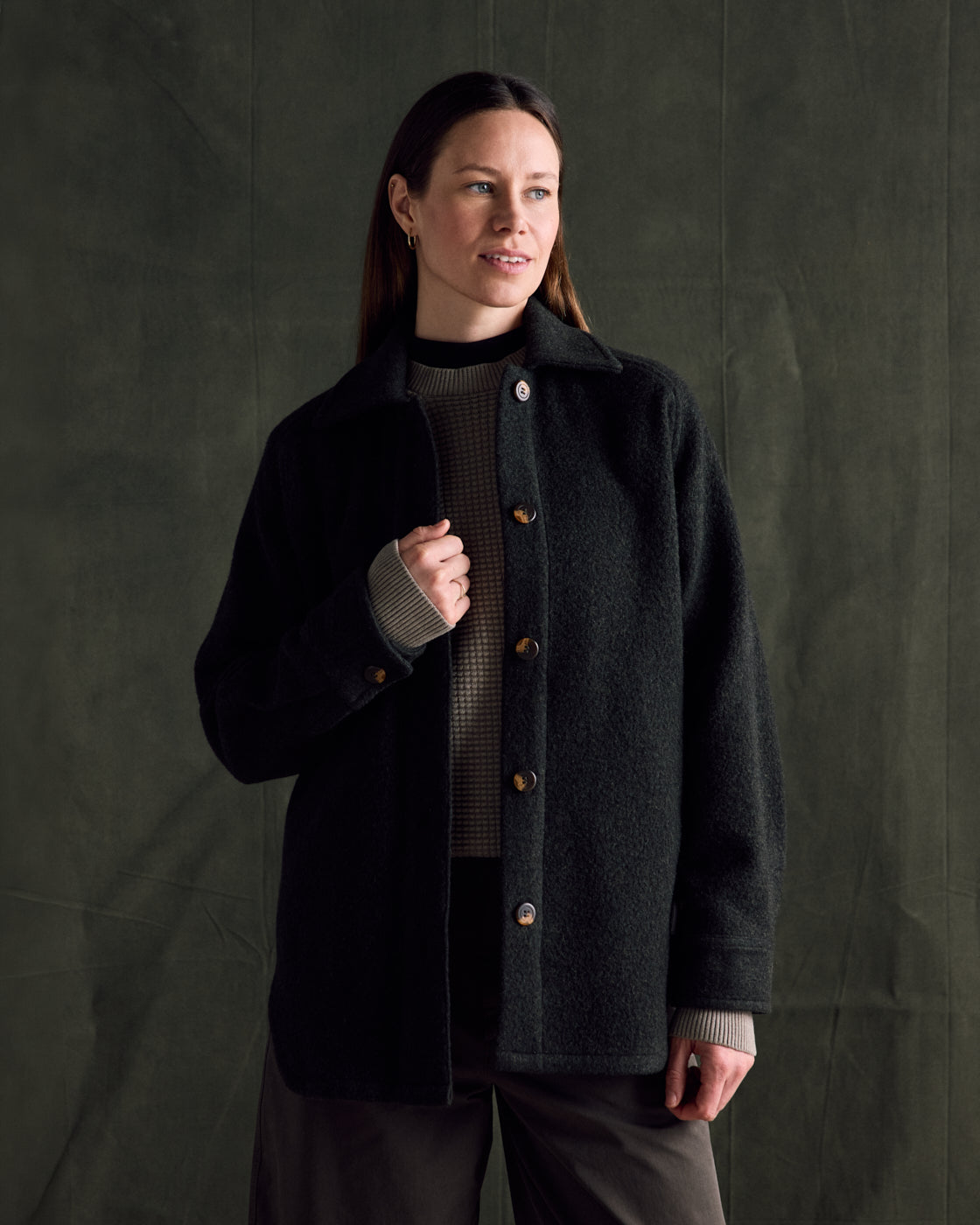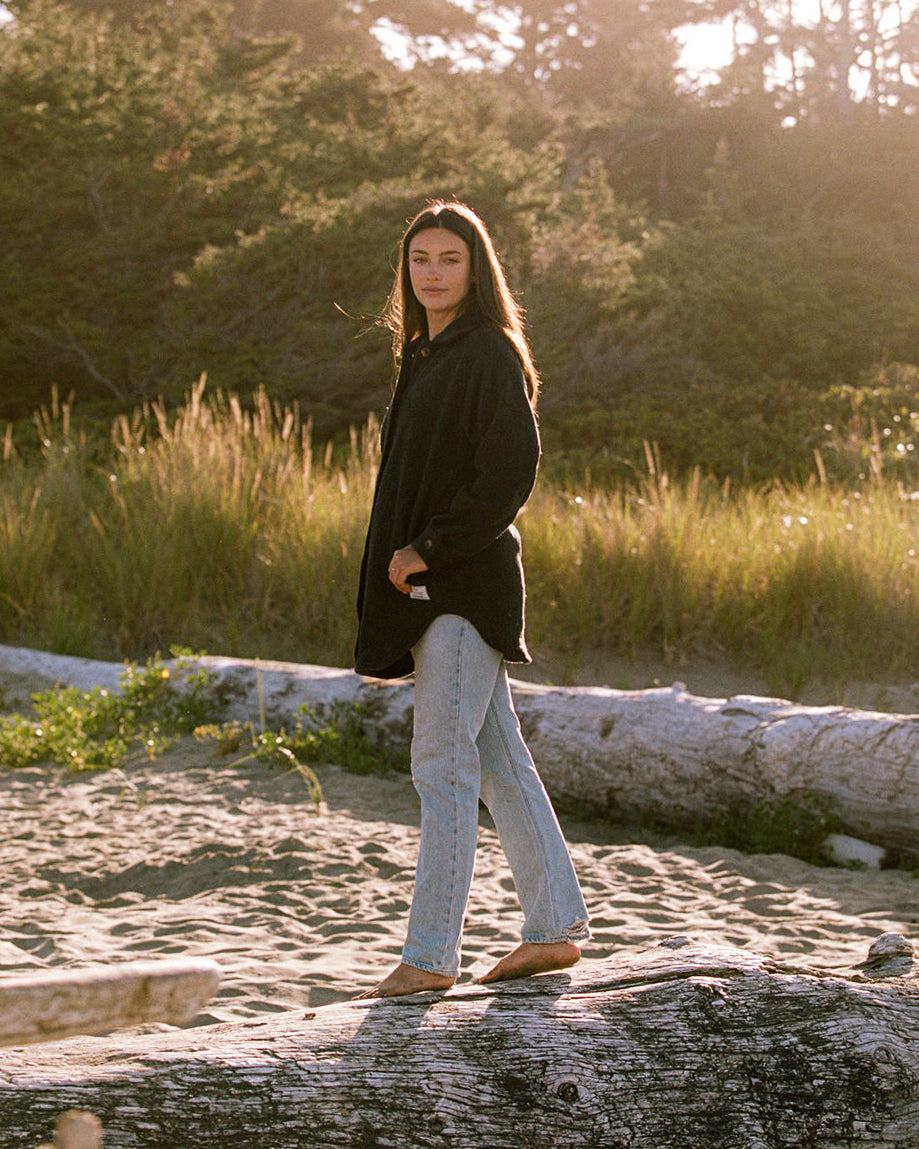 Fall weather has an artful kind of beauty—and we think Fall clothing should be just as beautiful, too. Soft, warm and subtly refined, our best-selling Loft Coat is made from a lofted, bouclé-like post-consumer recycled Agnello wool blend that breathes easily, sheds fog and showers, and keeps you cozy and comfortable in cool-to-cold temperatures. Made in our unique circular process with no added dyes, the weave is lush and easy-wearing, but still rugged enough for weekday commutes or weekend wanderings—similar to sturdy fleece, but with a more natural feel. The silhouette leaves enough room for easy layering and movement, with a long scalloped hem that falls below the seat.